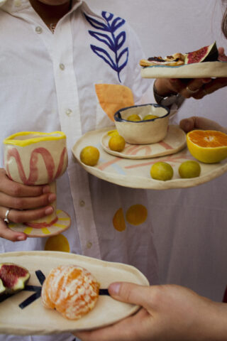 Die 12-teilige Keramik-Kollektion ergänzt das Thema Feiern haptisch. Durch das jahrtausendalte traditionelle Herstellungsverfahren und die zeitgenössische Bemalung und Farbgebung entsteht visuelle Spannung sowie eine inhaltliche Verbindung zu den noch heute gefeierten biblischen Festen. Der Kiddusch-Becher (Weinkelch) spielt innerhalb des Geschirrsets eine herausragende Rolle, gefüllt mit Wein ist er zentraler Bestandteil jedes Festes.