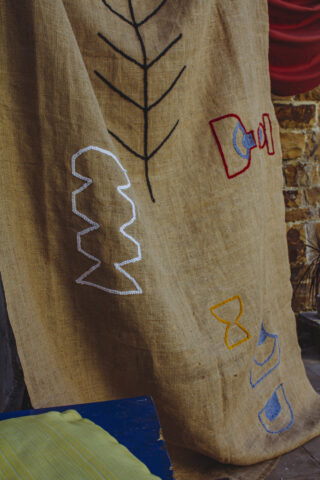 Die Decke (1,30×2,40m) dient zu Feierlichkeiten als Tisch-oder Picknickdecke und findet gleichermaßen als Wandbehang Verwendung. Hergestellt ist sie im Stanznadel (punch-needle)-Verfahren, wodurch beide Seiten als Sichtseiten genutzt werden können.