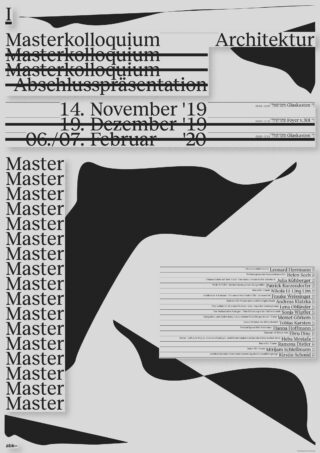 Dreiteilige Ankündigungsplakate für die Masterkolloquium Präsentationen im Studiengang Architektur an der Staatlichen Akademie der Bildenden Künste 2019.