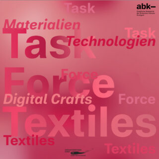 Im Rahmen der Initiative »Task Force Textiles« (TFT) des Studiengangs Textildesign werden unter anderem drei Arbeitsstipendien an baden-württembergischeTextildesigner*innen vergeben, drei Workshops zu den textilen Schwerpunkten Materialien, Technologien und Digital Crafts an der ABK Stuttgart durchgeführt sowie eine Ausstellung im Dezember 2021 zu eben diesen Themen veranstaltet.