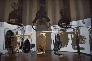 Jörg Mandernach, der im letzten Studienjahr eine Vertretungsprofessur an der ABK Stuttgart innehatte, überträgt diese Fragen auf seine Kunst. Auch seine Bilder und Zeichnungen zeigen sich wandelbar, wenn sie von Trickfilmprojektionen, Papierschnitten und Malereien überlagert werden. So ergeben sich in seinem überdimensionalen Mobile Gesamtbilder, die durch tanzende Bewegung immer neue Konstellationen von Schrift- und Bildzeichen vor uns entstehen lassen. Es fügen sich abstrakt anmutende Bildbestandteile zu etwas gegenständlich Lesbarem zusammen.