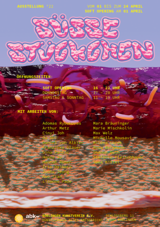 Beteiligte Künstler*innen: Adomas Rybakovas, Arthur Metz, Cinyi Joh, Da Shi, Daniel von Alkier, Franziska Glaser, Gina Pantic, Hanna Jo, Hannah Römer, Iris Daibert, Junho Jeong, Kuo Tian, Lisanne Pade, Mara Bräuninger, Marie Mischkolin, Max Welz, Michelle Mousavi, Milena Lorek, Rosa Bergmann, Shanon Guth, Stefanie Fleischhauer, Swea Kittel