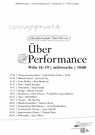 Ziel der Vortrags- und Gesprächsreihe Über Performance ist es, einen Überblick über die vielen verschiedenen Ideen, Methoden und Vorstellungen zu geben, die mit dem Begriff der Performance bzw. des Performativen verbunden sind.
