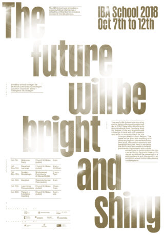 This year’s IBA School is all about big visions. What is Stuttgart going to look like in 2050? Nine international architecture schools from Germany, Austria, Malawi, Chile and Argentina will converge to deal with this question and work on visionary ideas for the Stuttgart Metropolitan Region. The week will be filled with inspiring activi-ties ranging from intense workshops, field trips, discussion sessions and breakfast lectures. Next to students the IBA School also wants to invite all passionate city planners and culture enthusiasts to participate in the discourse. During the grand finale on Friday all results will be presented to a wide audience and displayed in an exhibition where further discussions can take place.