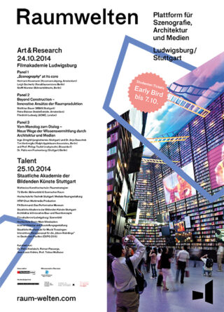 Raumwelten Art & Research (24.10.2014, Filmakademie Ludwigsburg) ist der Kongressbereich von Raumwelten: Internationale Experten, Kreative und Kuratoren stellen Trends und Tendenzen der Szene vor und thematisieren die Produktion und Rezeption öffentlicher und privater, kultureller und kommerzieller Räume.