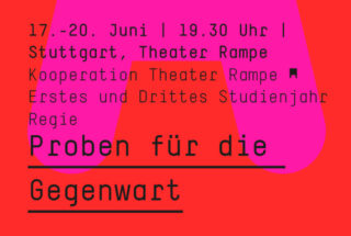 Über das Projekt: Wie nehmen junge Künstler Gegenwart wahr? Überschlagende Weltereignisse, komplexe Wirklichkeiten, globale Vernetzung prägen die Gegenwart, die es ästhetisch zu bearbeiten gilt. Elf Studierende der Regie aus drei Jahrgängen nehmen diese Herausforderung an. Sie begegnen ihr mit Utopien, steigen aus gewohnten Perspektiven aus und zeigen Lust am Komplexen. Gemeinsam mit ihren Künstlerteams und Studierenden Schauspiel und Dramatugie der ADK sowie Kostüm- und Bühnenbild der Staatlichen Akademie der Bildenden Künste Stuttgart errichten sie ein Labor der Zeitgenossenschaft und entwickeln theatrale Projekte: Exkurse, Experimente, Einblicke in die Theaterwerkstatt.