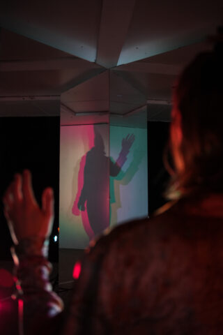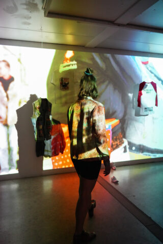 In der Rauminstallation meiner Bachelorarbeit beschäftige ich mich in erster Linie mit dem thematischen Teilaspekt der eigenen Identität. Was stelle ich nach Außen dar, und welche Vorstellungen projizieren Andere auf mich – je nach Umfeld und Kontext. So gelangen manchmal einzelne Identitätsfacetten mehr zum Vorschein bzw. treten an anderer Stelle in den Hintergrund. Demnach verkörpere ich in meiner Video-Performance das Sprichwort »Kleider machen Leute«.