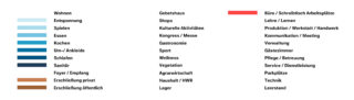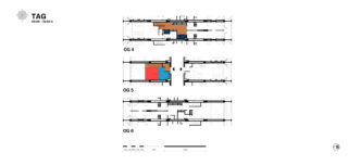 Die bereits vorgestellte Funktionslegende (siehe Case Study Living 4.0 #1) dient als Grundlage für alle folgenden Analysen der Unité d’habitation in Marseille von Le Corbusier (1952). Als erstes wird eine klassische Funktionsanalyse von zwei exemplarischen Maisonette Wohnungen in der Unité d’habitation betrachtet (Wohnung 1: OG 4 – OG 5 und Wohnung 2: OG 5 – OG 6). Die Funktionen sind, wie in der klassischen Moderne üblich, klar definiert und voneinander getrennt. Die Flächen scheinen effektiv angeordnet und gut ausgenutzt zu sein. Es fallen bereits bemerkenswerte Details wie beispielsweise Schiebewände auf, die für eine zukunftsgewandte und flexible Wohnsituation sprechen.