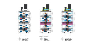 Für die anschließende Untersuchung einer möglichen Transformation der Wohnmaschine zur hybriden Space Sharing Maschine wurden die klassischen Wohnungsgrundrisse auf den Gebäude Maßstab der Unité d’habitation übertragen. Die Analysegrundlagen wie die Funktionslegende und die Unterscheidung der Zeitintervalle bleiben hierbei unverändert, um Vergleiche zwischen den Analysen herstellen zu können.