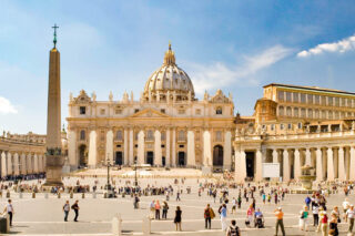 Verschiedene Ansichten des Petersdoms sind beim Rundgang 2020 an der Fassade der ABK Stuttgart zu sehen. Außerdem auch ein Bild von Michelangelos Jesus, aus dem Gemälde „das Jüngsten Gericht“ in der Sixtinischen Kapelle.