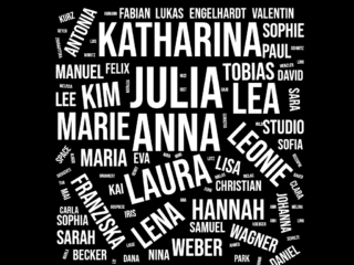 Wer immer schon mal wissen wollte, welche Namen an der ABK am häufigsten vorkommen ist hier richtig. Die word cloud ‘distribution of names’ zeigt die häufigsten Namen der ABK Stuttgart laut den Rundgangsteilnahmen 2020 nach Schriftgröße sortiert. So viel sei verraten: die ersten drei Plätze belegen die Namen Julia mit 16 stolzen Namensträger*innen, dicht gefolgt von 13 Annas und 10 Katharinas/Lauras.