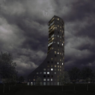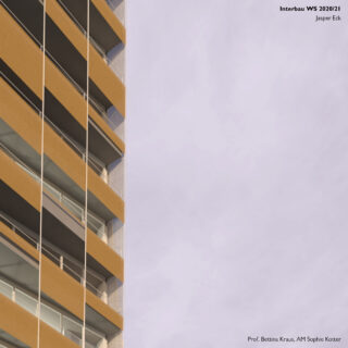 Im Rahmen des Masterplans soll am westlichen Ende des Hansaviertels ein neues Punkthochhaus mit gemischter Nutzung entstehen. Aus den volumetrischen Experimenten am Werkstück entstand die schwungvolle Form, die die Geschwindigkeit der benachbarten S-Bahn aufnimmt und in eine Drehung übersetzt. Das Gebäude hat eine klare Orientierung: Die terrassierte, offene Seite wendet sich dem Park zu, während die geordnete Lochfassade einen urbaneren Anschein in Richtung der Stadt vermittelt und somit gleichzeitig Distanz zur S-Bahn wahrt. Funktional schließt das Gebäude mit seiner Erdgeschossnutzung an die bunten Nutzungen unter den S-Bahn Bögen an, in den Geschossen 1 und 2 befinden sich kommerzielle Nutzungen und darüber Wohnungen. Der gelbe Sonnenschutz reflektiert mit seiner ständigen Veränderung das Leben im Inneren des Gebäudes und dient als zentrales gestalterisches und kommunikatives Element.