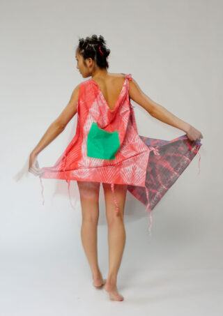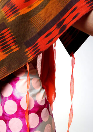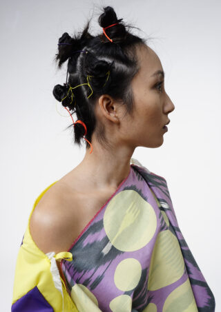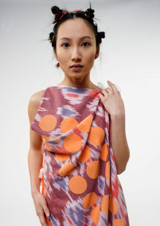 Die geometrischen Formen Kreis, Oval, Rechteck und Quadrat werden durch das Siebdruckverfahren auf die usbekischen Stoffe aufgetragen und schaffen so eine Überlagerung von Grafik und traditionellem Muster. Farbexperimente und weitere textile Veredelungstechniken vervollständigen die Kollektion.