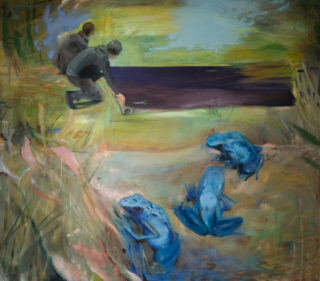 Bei dieser Arbeit bin ich assoziativ vorgegangen. Bei einem Besuch im Zoo, fielen mir die Frösche auf, wie sie die Blätter umher geschoben haben, um sich Raum zu schaffen. Beim Betrachten alter Fotografien fiel mir die gleiche Bewegung bei Freunden auf, die einen Teppich zusammenrollten. Eine Wiederholung eines bestimmten Verhaltens, einer bestimmten Bewegung in zwei scheinbar völlig verschiedenen Lebenswelten.
