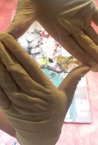 In ironischer Weise verbindet die Künstlerin einfache, skizzenhafte Robbenzeichnungen auf Eisschollen in lieblichen Farben mit dem, im Gegensatz dazu, sehr gewaltvollen Titel “Hakapik”. Der Hakapik ist eine Tötungswaffe, die vorzugsweise bei der Robbenjagd verwendet wird.