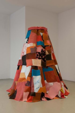Die Skulptur „Home“ entspringt der Idee eines großen Rockes. Frau, Mutterschoß, Geborgenheit, Bewegung, am Rockzipfel hängen – das ist für mich „Home“. Das ist der Titel dieser Arbeit. Heimat scheint mir nicht primär ein Haus oder ein Ort auf der Landkarte zu sein, sondern viel mehr etwas, was wir fühlen, erinnern und wünschen und sich daraus der Drang einstellt, diesem fühlen, erinnern und wünschen ein Haus oder einen Ort auf der Landkarte zu suchen. Die Antwort auf die Frage nach der eigenen Heimat, liegt für mich in einem Spannungsfeld zwischen der Herkunft und dem Ort wo man sein Leben begründet und sich niederlässt. Je weiter diese beiden Orte auseinander liegen, desto größer ist das Defizit an beiden Ufern und umso schwerer die daraus resultierende Herausforderung, die Heimat für sich selbst zu definieren. Die aktuelle Arbeit „Home” die zu dem Projekt „Heimat ist die Fremde“ gehört, ist ein Prototyp. In einer Ausstellung wird die Form und die Größe den räumlichen Bedingungen angepasst werden. Die Skulptur soll den Raum vom Boden bis zur Decke ausfüllen.