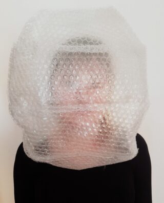 Die Klasse Windelen hat im letzten Semester ein Klassenprojekt durchgeführt, das trotz räumlicher Isolation die persönliche Nähe zum Gegenüber sucht. Der Arbeitsauftrag: Jede/r Student/in sammelt Material seiner Wahl und hinterlässt es einem seiner Mitstudierenden in einem digitalen Schließfach. Die Materialien sollen dem virtuellen Gegenüber als Quelle, Inspiration oder Anhaltspunkt dienen. Der im Voraus auserwählte Student findet die Materialien online vor und darf mit ihnen frei umgehen und sie nach Belieben in seine eigene Arbeit einfließen lassen. In meiner Arbeit geht es um das Gefühl des Erstickens in der Beengtheit der Isolation. Als Material hatte ich von Julia Kiefer das Schnittmuster eines Ballonrocks erhalten, was mir als Anleitung für das Objekt aus Luftpolsterfolie diente, welches einer Blase ähnlich meinen Kopf umgibt.