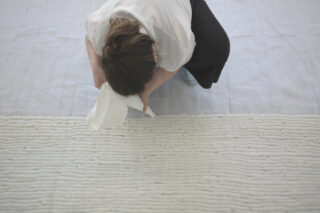 Mit einem Dressierbeutel aufgetragene Linien aus Papierfasern verknöchern im Ausstellungsraum durch ihren Trocknungsprozess. Eine materialimmanente Linienzeichnung entsteht.