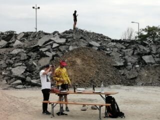 Im Rahmen einer Einladung von Einraumhaus C/O erklärten wir Schuttberge einer Baustelle auf dem Gelände der ehemaligen Franklin- Barracks zum Gebirgsmassiv. Wir umkreisten die Erhebungen mit jeweils ca. 1,50 m Höhenunterschied. Je höher wir stiegen, desto kleiner wurde der Radius. Während unseres Wanderns trackten wir uns mit einer App, um unser Bewegungsprofil aufzuzeichnen. Durch das spätere Einpflegen der erfassten Daten in die Satellitenaufnahme von Google Maps, erzeugten wir ein Höhenprofil, wie es von Wanderkarten bekannt ist. Dies manifestierte sich zudem analog, durch Spuren in Sand oder Schotter.