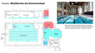 Die Multikirche sind rein konzeptuelle Abwandlungen des Raum- und Raumnutzungsprogramms der Leonhardskirche zu neuen sozialen und architektonischen Räumen. Die Arbeit entstand in Kooperation mit Studierenden der EH Ludwigsburg.