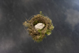 Mitten im Raum schwebt ein kleines, moosgrünes Vogelnest. In dem Vogelnest liegt in embryonalstellung eine kleine, blasse, menschliche Figur. Sie erinnert ein wenig an ein Ei.