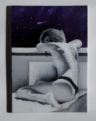 Die Arbeit entstand infolge der Quarantäne, und es war für mich der Erste Schritt in der Malerei. Das kleine Format hat mich ermöglicht Mich an die ganz winzigen Details, und dabei mein eigene still in der zu erfinden.