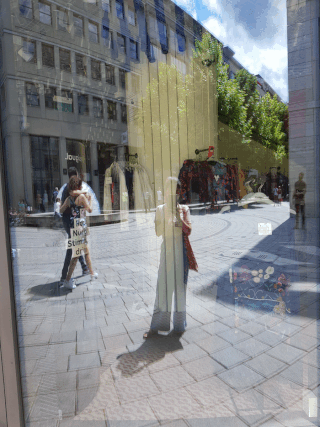 Wenn ich in die Schaufester der geschlossenen Läden gucke, sehe ich in den Fenstern nicht nur den inneren Raum, sondern auch die Spiegelung der äußeren Straßenszene. Dann erscheint eine neukombinierte Welt auf der Fensteroberfläche. Mich beeindruckt, dass die inneren und äußeren Räume gleichzeitig sichtbar sind, wie in einer von Koexistenz geprägten, surrealen Welt. Deshalb habe ich meine Sehnsüchte nach den Urlaubsorten auf die Fenster projiziert und mit der realen Umgebung vermischt. Die reflektierte Welt auf den Fenstern verkörpert meine Fantasie, Hoffnung und neue Nostalgie.