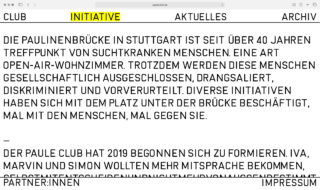 Das Projekt Paule Club ist ein gemeinnütziges, finanziell gefördertes Projekt welches in Kooperation mit dem Theater Rampe und dem Paule Club entstand. Der Club besteht aus Mitgliedern der sogenannten »Paule-Szene«, des Österreichischen Platzes/der Paulinenbrücke. Die Webseite dient als Platform zum Austausch suchtbetroffener Menschen und agiert als Sprachrohr an die Außenwelt – zur Integration gesellschaftlicher Randgruppen.