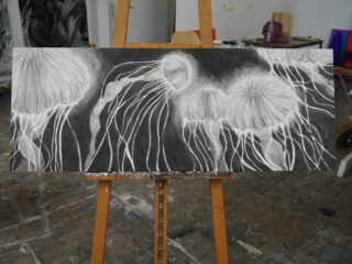 Quallen sind sehr beeindruckende Tiere. Sie schweben fast regungslos durch die Meere und sind nicht wirklich greifbar. Hier habe ich das Vorbild einer Kompassqualle in meinen Stil übersetzt. Die Körper und Tentakel sind mit Spachtelmasse vorgearbeitet und im Anschluss mit Tusche ausgearbeitet.