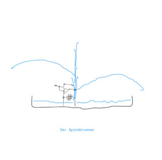Der pompöse Springbrunnen des unteren Schlossgartens wird zum interaktiven Spinnbrunnen und verspricht Abkühlung in diesen heißen Tagen. Ein Parasit, gebaut aus Ready-Mades von den Stuttgarter Straßen, klammert sich an die Düsen und ernährt sich vom Wasserdruck der Fontänen.