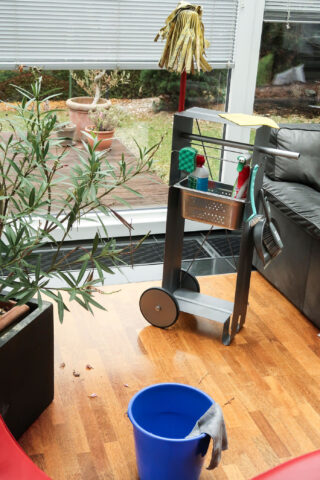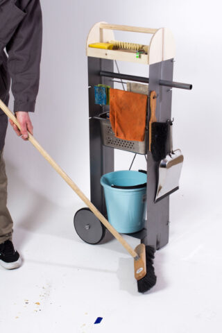 Daraufhin gestalte ich einen Putzwagen, welcher die nötigsten Reinigungsutensilien aus den dunklen Nischen der Wohnung in die Gegenwart rückt und den stetig kursierenden Schmutz auf seinen Routen durch die eigenen vier Wände verfolgt. Der Putzfreundlichkeit zuliebe lässt sich das Edelstahlgestell komfortabel in seine Einzelteile zerlegen und bleibt selbst beim unsachgemäßen Putzen mit aggressiven Reinigungsmitteln beständig.