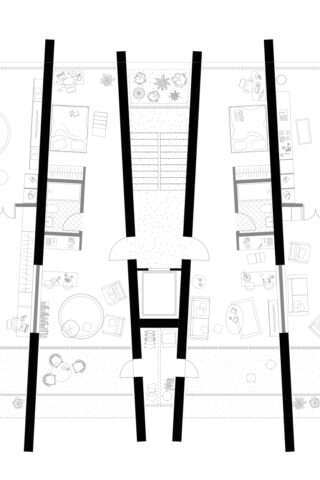 Eine Wohnform, die durch die Tiefe des Gebäudes durchstecken. Ein Wandsystem, das streng und stark gerichtet ist.