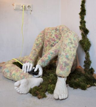 Die menschliche Figur ist fexibel un kann verschiedene Positionen einnehmen. Die Installation befindet sich noch im Prozess und ist noch nicht fertig, so wie sie aktuell zu sehen ist.