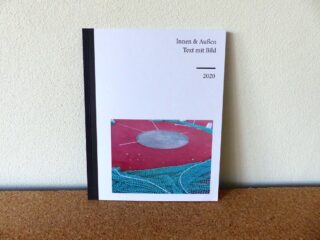 Auf einem Sockel liegt ein Magazin zur Ansicht bereit mit dem Titel: INNEN & AUßEN von 2020. Zu sehen sind Farbfotografien von Sportstätten in Kombination mit Texten.
