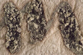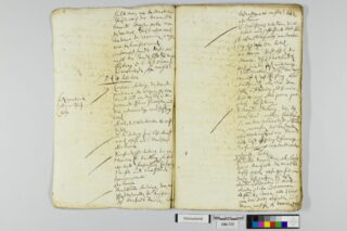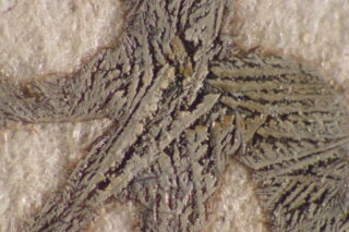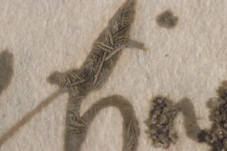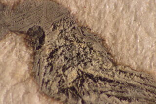 In dieser Zeit wurde, ähnlich wie heute, die „dokumentenechte“ Eisengallustinte für wichtige Staatsdokumente verwendet. Traditionell wird Eisengallustinte aus einem Extrakt aus Galläpfeln, Eisen(II)sulfat, Gummi Arabicum sowie weiterer Zusätze hergestellt. Bei einem unausgewogenen Verhältnis dieser Komponenten liegen oft freie Eisenionen vor, die die Haltbarkeit des Papiers negativbeeinflussen. Der so genannte Tintenfraß führt zunächst zu einer Verbräunung des Papiers im Bereich mit starkem Tintenauftrag, es entstehen schmale braune Höfe um die Schrift (Abb.2). Bei fortschreitendem Tintenfraß bilden sich Risse entlang der Tintenlinien, ganze Schriftzüge können ausbrechen und verloren gehen. Teile des Tintenauftrags wirken wie von einem Schleier bedeckt. Dieser Eindruck wird durch Kristalle auf der Oberfläche der Schrift hervorgerufen. Die Kristalle sind bei 40-facher Vergrößerung unter dem Mikroskop gut zu erkennen. Oft wurde die Schrift zum schnelleren Trocknen mit Löschsand bedeckt. Von diesem Sand liegen nach wie vor größere Mengen sowohl auf dem Tintenauftrag verkrustet als auch lose vor. Andere Kristallformen könnten auf einen hohen Gehalt an Eisensulfatverbindungen in der Tinte hinweisen. Teilweise scheint es sich auch um Gipsnadeln zu handeln, die sich aus der in der Tinte enthaltenen Schwefelsäure und vermutlich aus dem Papier stammendem Calciumcarbonat gebildet haben.