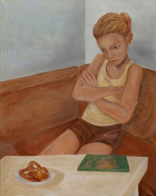 Der Widerstand ist ein natürlicher Zustand eines Kindes – es ist alltäglich. Es entsteht beim Formen vom eigenen Selbstwertgefühl und damit einer ganz persönlichen subjektiven Vorstellung vom Guten und Schlechten. Der Prozess ist dynamisch, was Gestern einen noch begeistert hat kann einen Tag später frustrieren. Die Bildung eigener Persönlichkeit geht Einher mit klaren Statements von was ich will und was nicht, einer Art Machtkampf mit Eltern, die es immer besser zu wissen scheinen. Ob Eltern dabei auf die realen Bedürfnisse der Kinder eingehen? In diesem Bild habe ich eine typische Situation zwischen mir und meiner Tochter dargestellt, die meiner Bitte wiederstrebte sie beim Lesen zu portraitieren. Dieses Ringen und dessen Ursprung wollte ich auf diesem Bild festhalten.