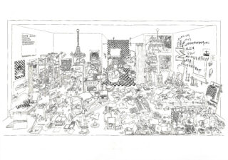 Das Wimmelbild stellt einen fiktiven Raum junger Künstler dar, die dort exzessiv leben, arbeiten und chaos machen.